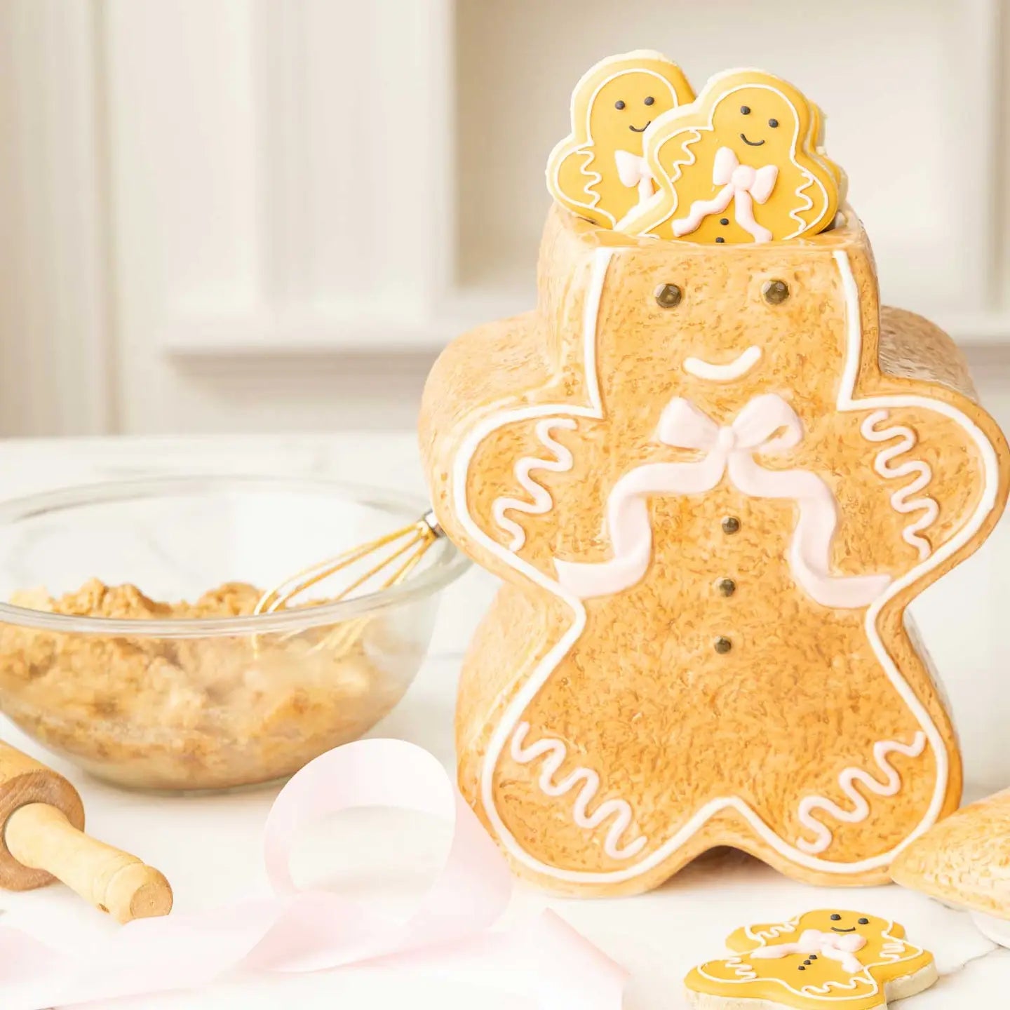 Add a touch of festive warmth to your kitchen with the charming Gingerbread Cookie Jar. This whimsical jar is designed to look like a gingerbread cookie, complete with delightful icing details, a pink bow accent, and a fun, gingerbread man-inspired shape. Made from durable ceramic, it's not only a functional storage piece but also a festive decoration that brings the sweet, cozy spirit of the season into your home.