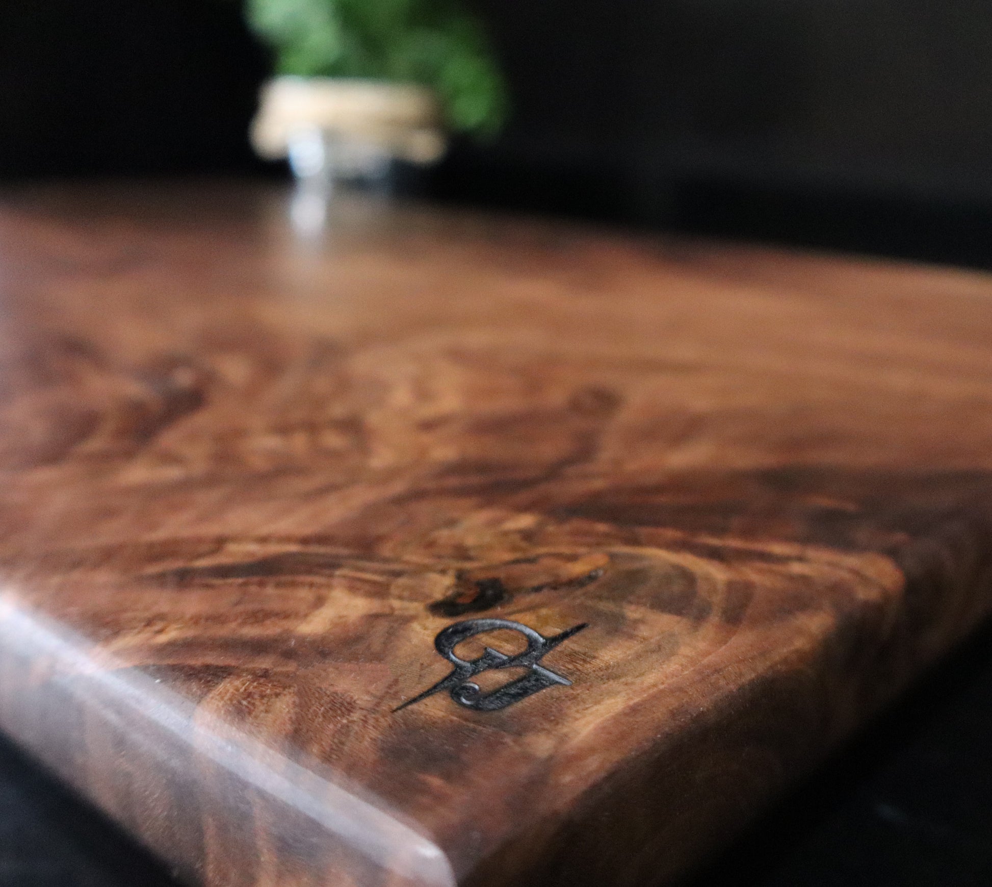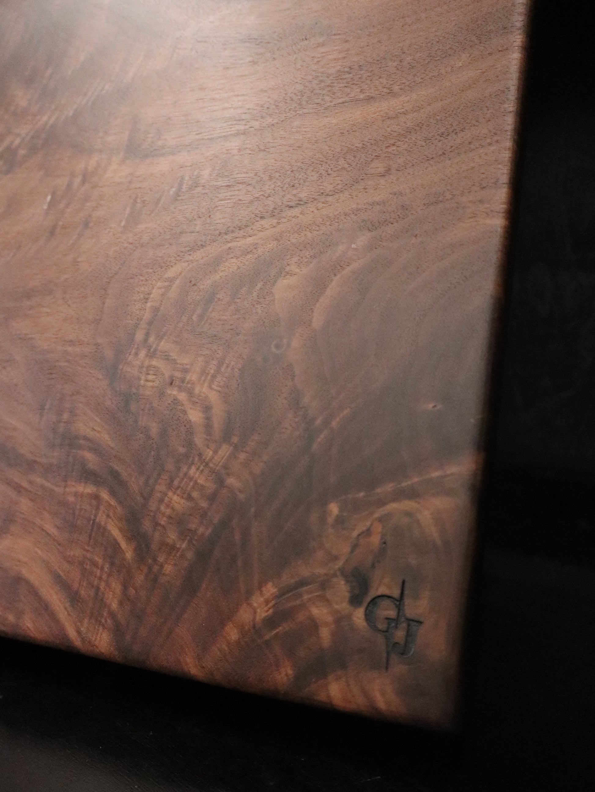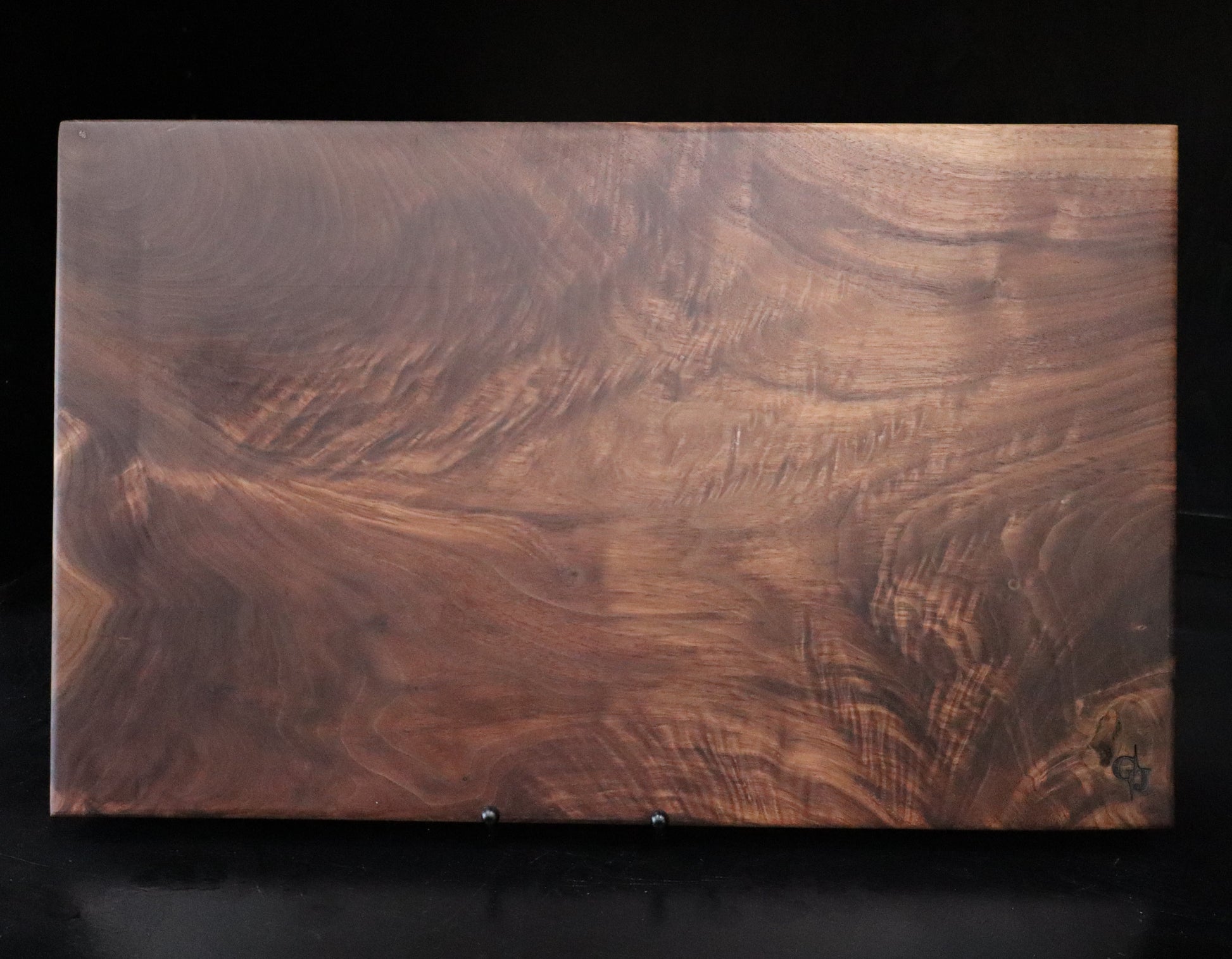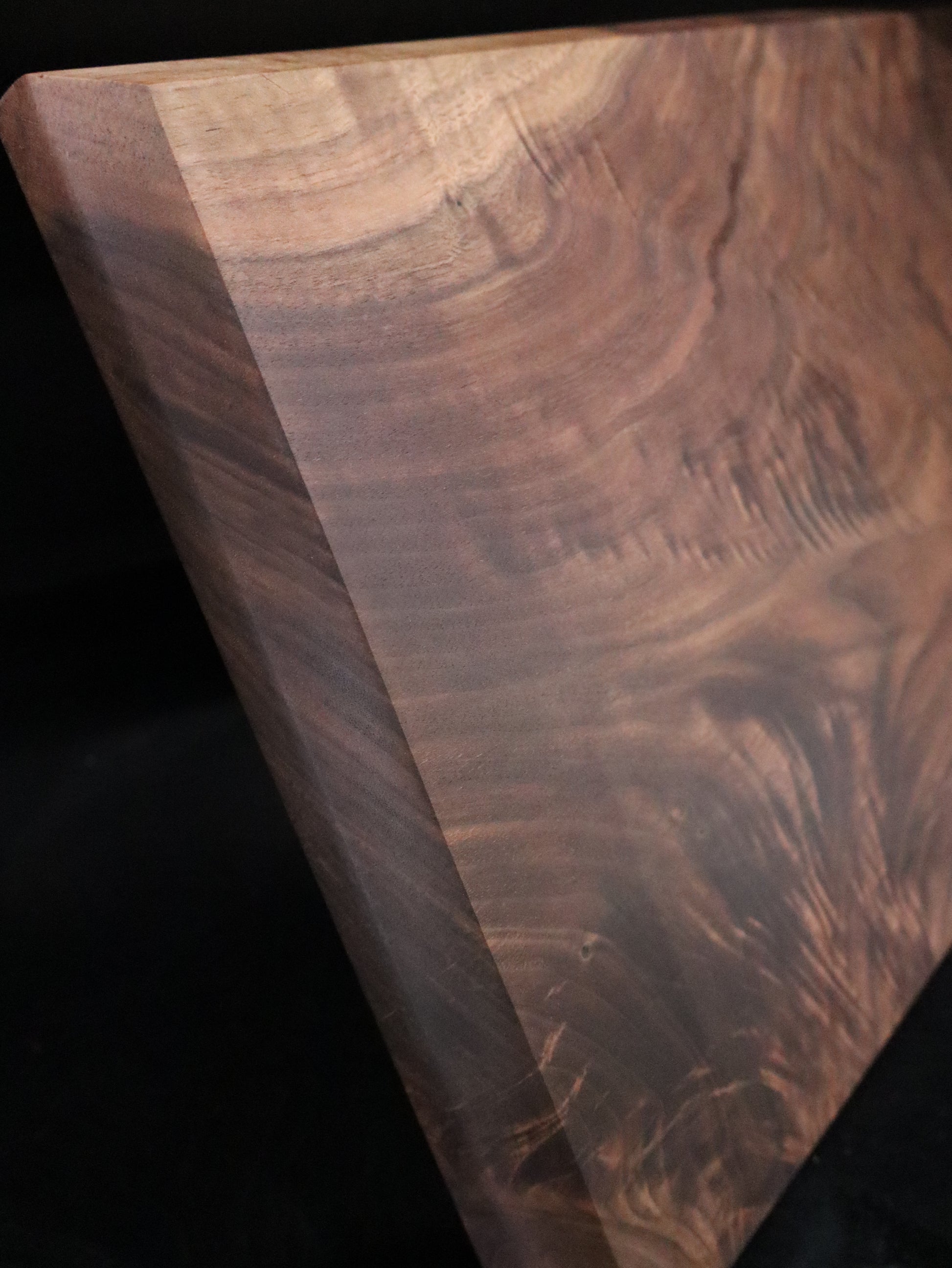 This solid, high-figure curly black walnut hardwood cutting or serving board measures approximately 19.5" x 12" x 1.5". It is a one-of-kind piece that would make a beautiful addition to your kitchen or a fantastic gift for any occasion!
